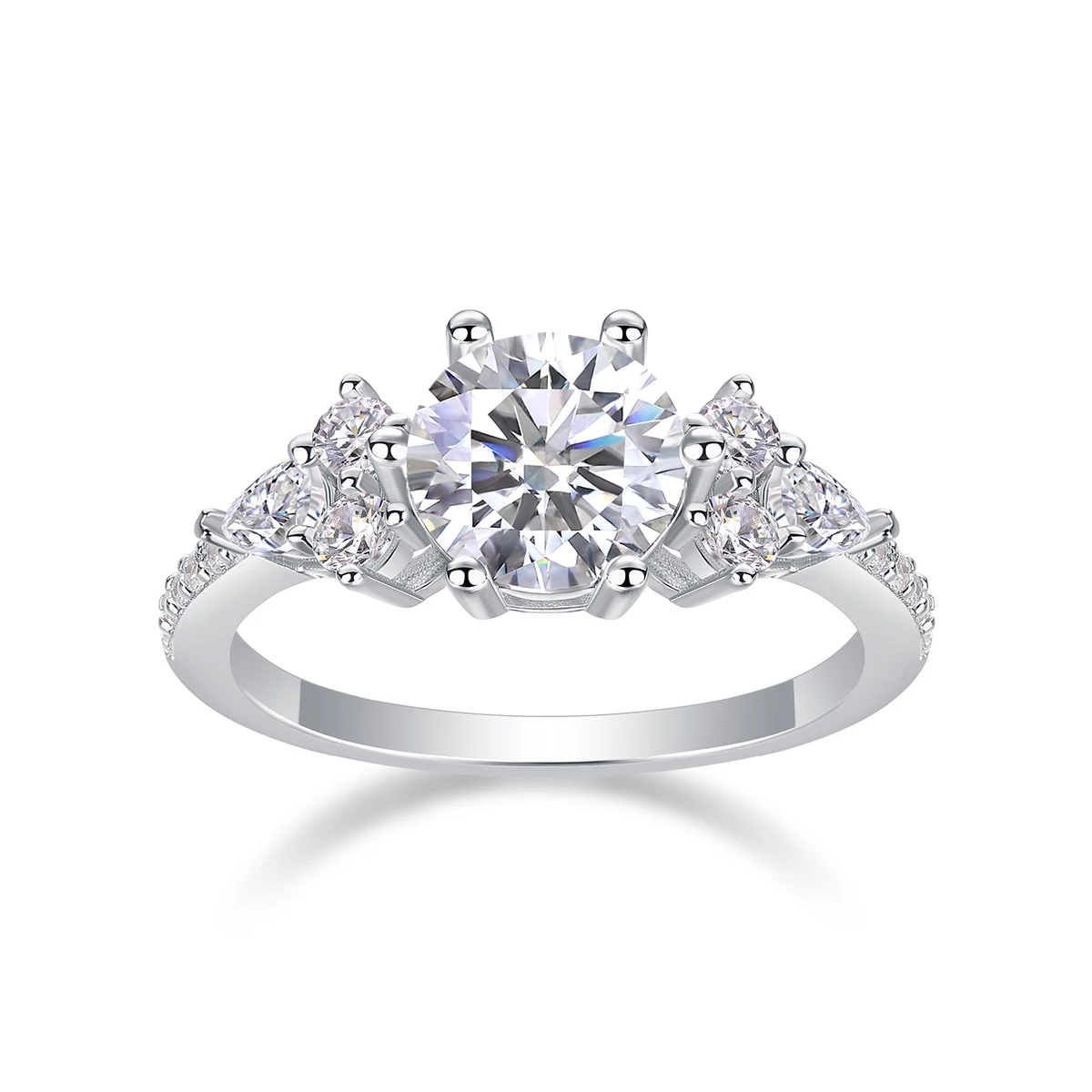 - You enjoy a 2ct total Moissanite arranged in a classic three-stone setting with a secure prong design for maximum light and brilliance.