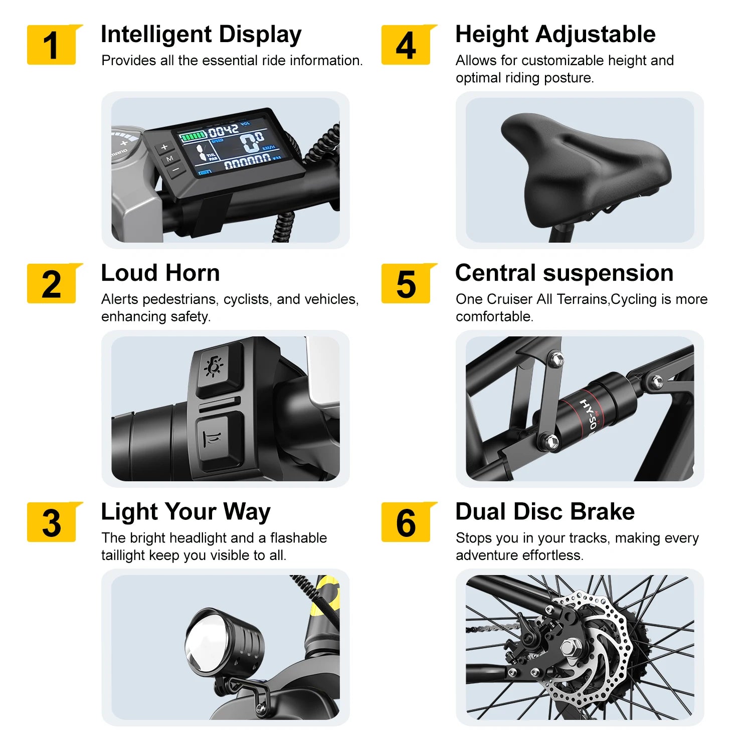 - Smart display and safe stopping with an NFC LCD display for real-time slope and battery data, plus a high-brightness LED headlight and front/rear mechanical disc brakes.