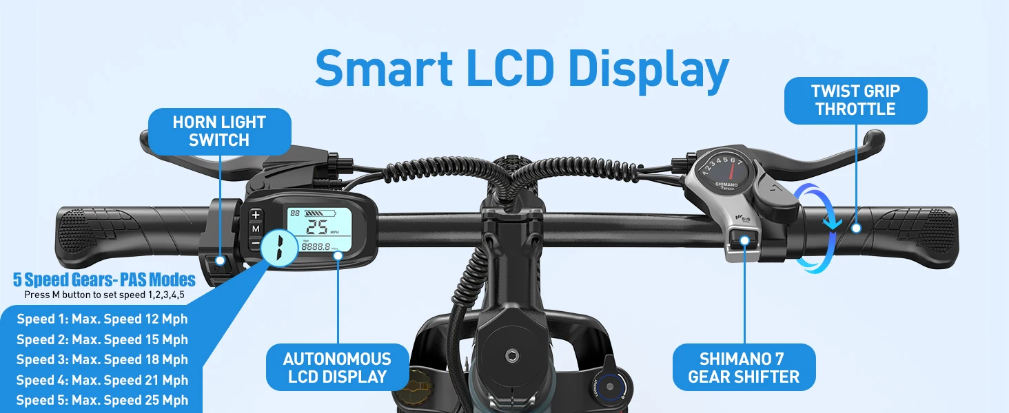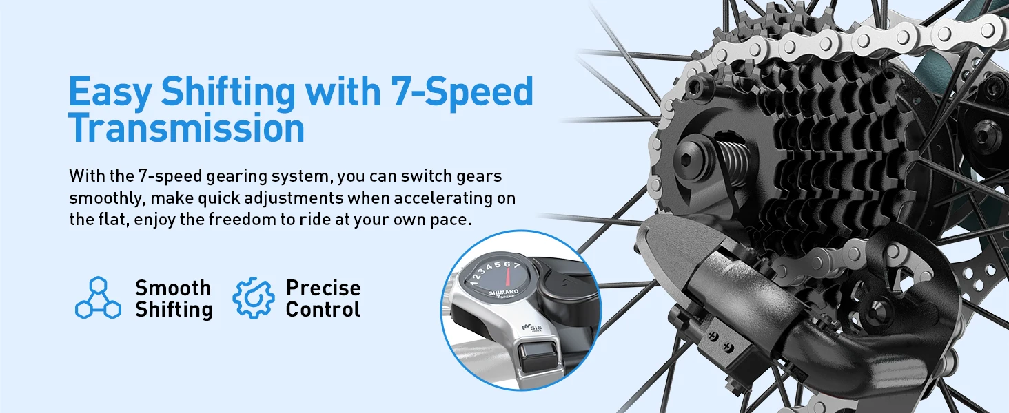 - You can ride up to 65 km per charge with the safety-certified battery, while the dual Shimano 7-speed and 5-speed electronic gearing adapts to every terrain.