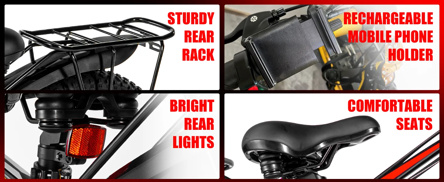 - Enjoy confident handling thanks to 26x4.0 inch fat tires, front fork suspension, and reliable front/rear mechanical disc brakes for braking control in all conditions.