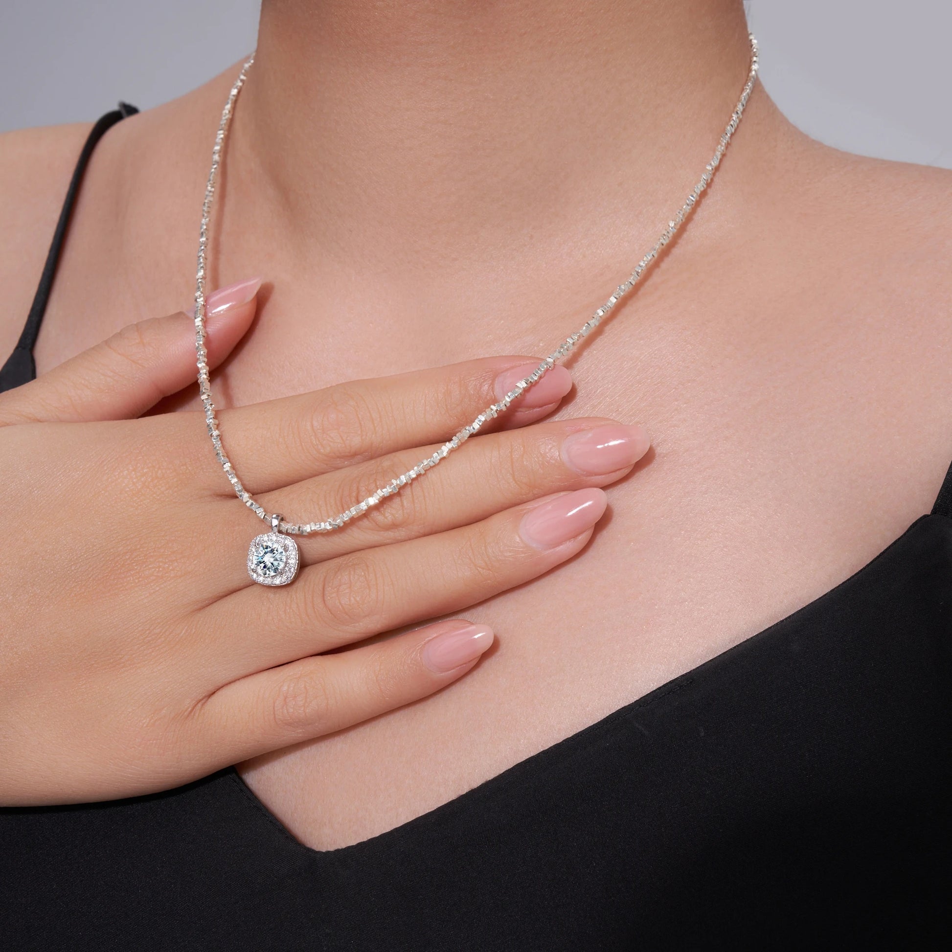 - You get 17 moissanite stones set in a square pendant, delivering radiant sparkle with VVS1 clarity and color D, for maximum radiance.
