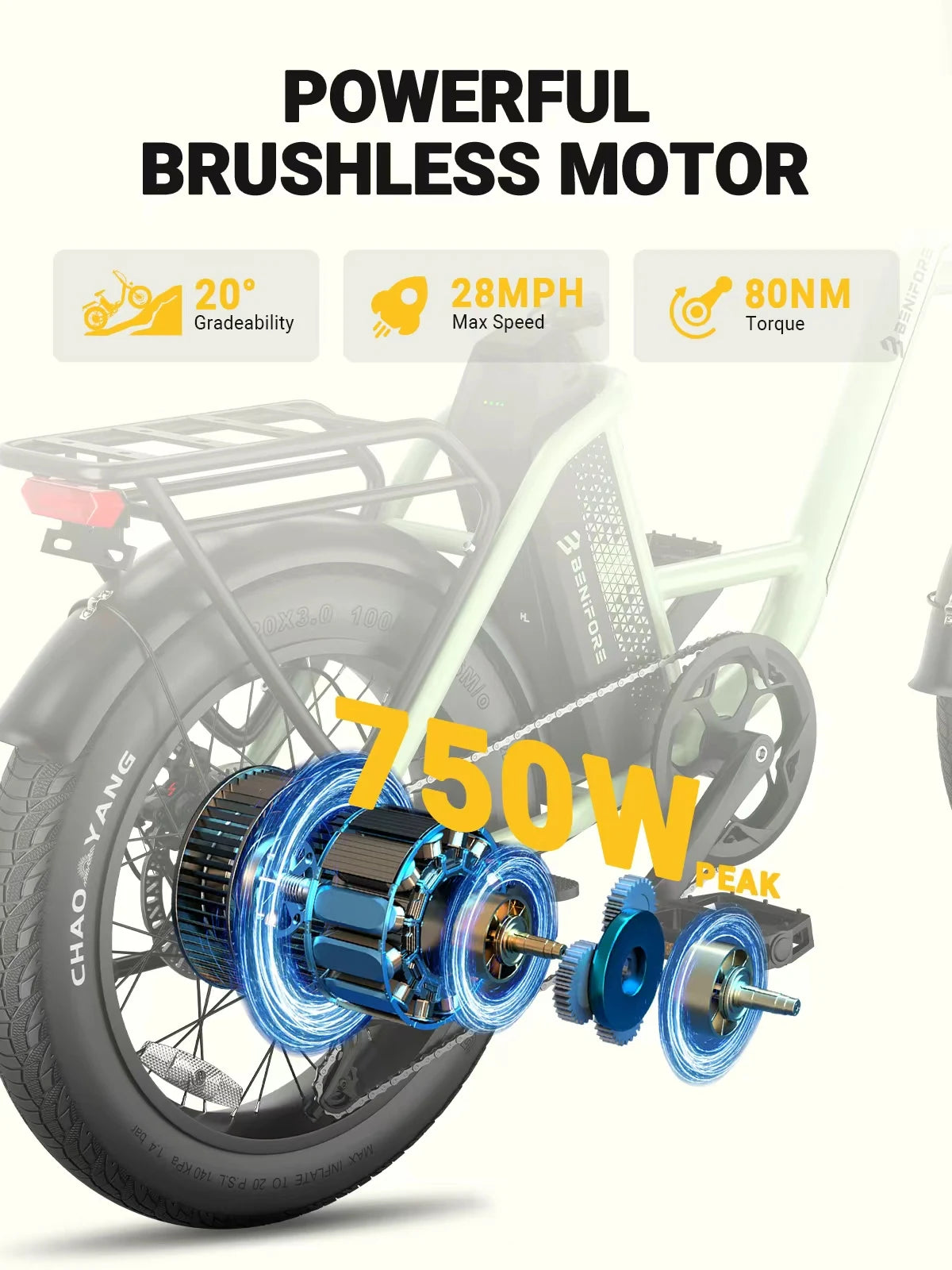 - Powerful 750W peak motor powers you up to 28 mph and conquers 20% inclines, while your 48V 624Wh battery supports up to 55 miles per charge, with IPX6 waterproofing for all-weather rides.