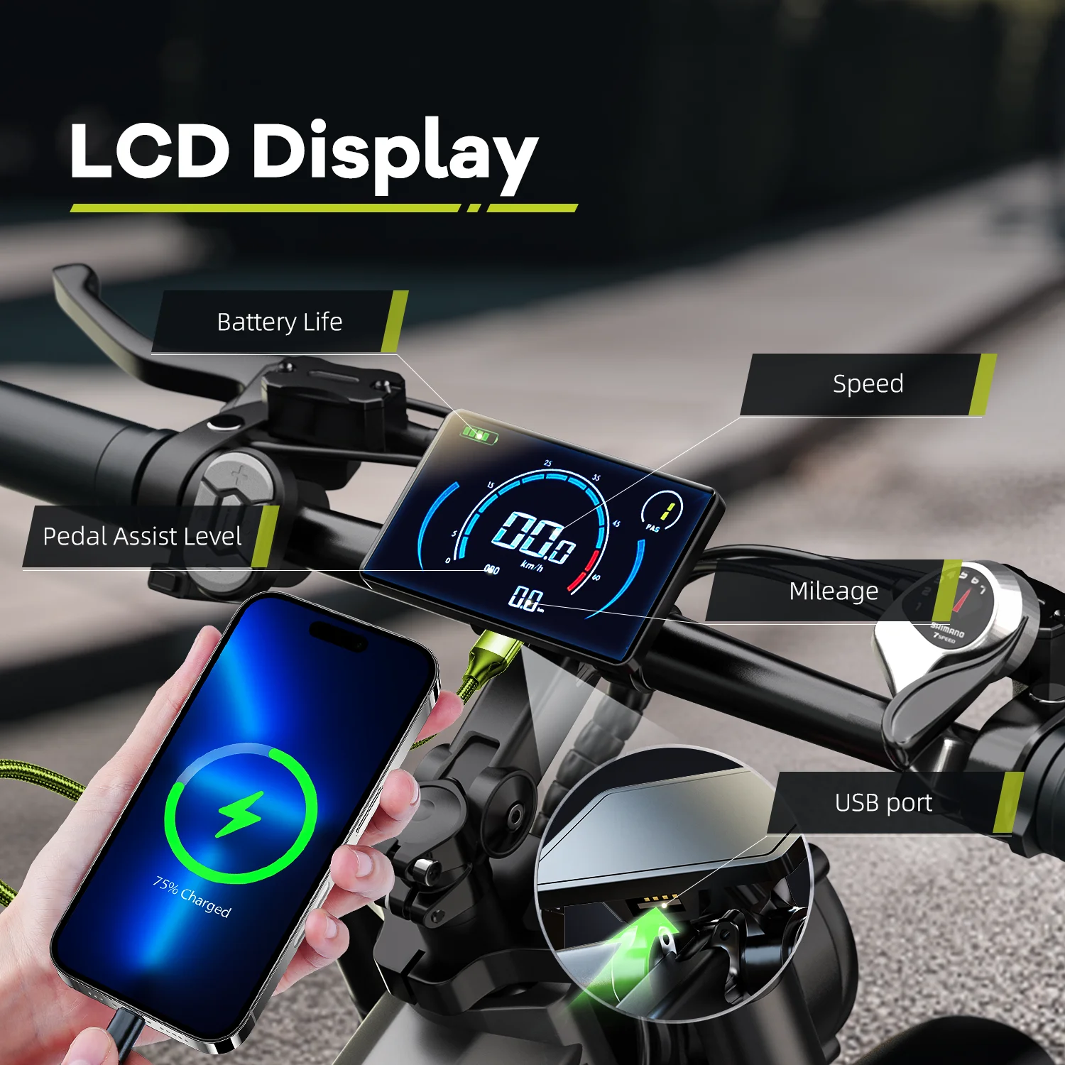 - Intelligent LCD Display shows battery, current speed, distance, power output, and riding time, with seamless lighting control for safer night riding.