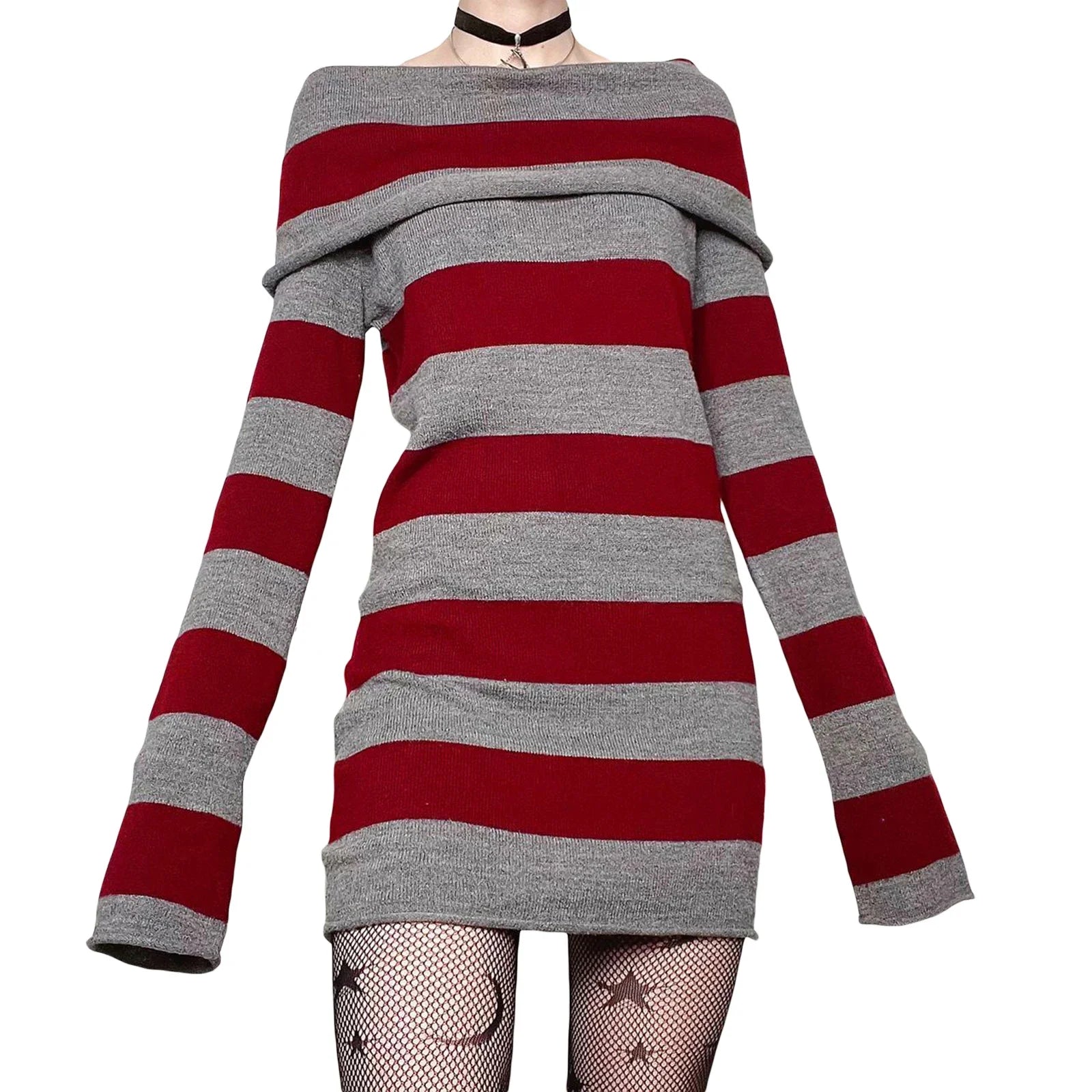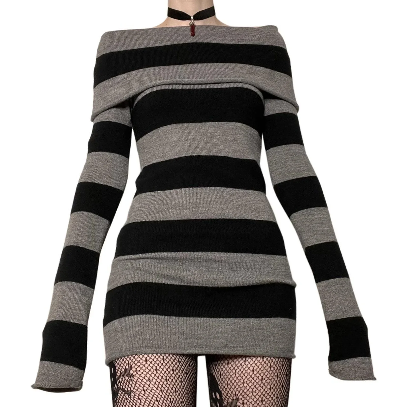 Women Striped Mini Bodycon Dress Stripe Boat-Neck Off Shoulder Long Sleeve Short Dress Spring Autumn Wrapped Hip Party Dress